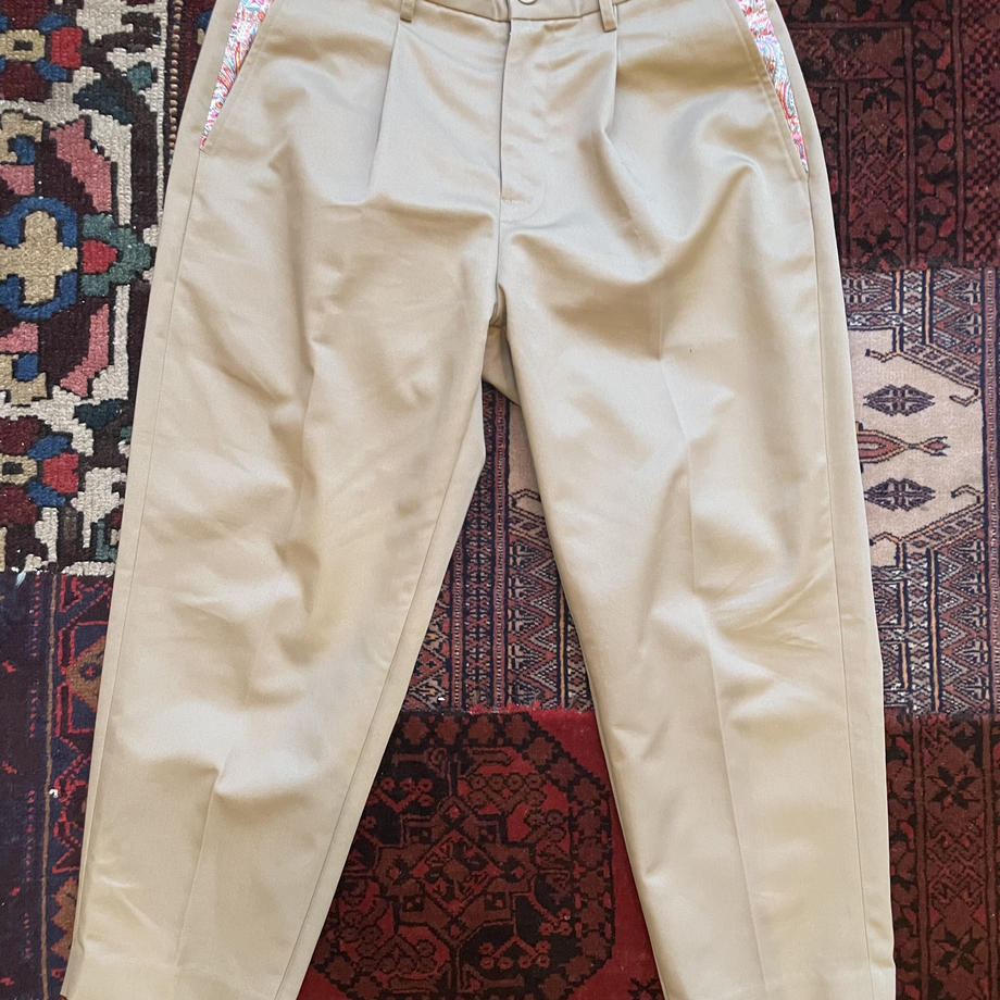 深い股上と特徴的なテーパードシルエット、ポケットに隠れたリバティプリント。
