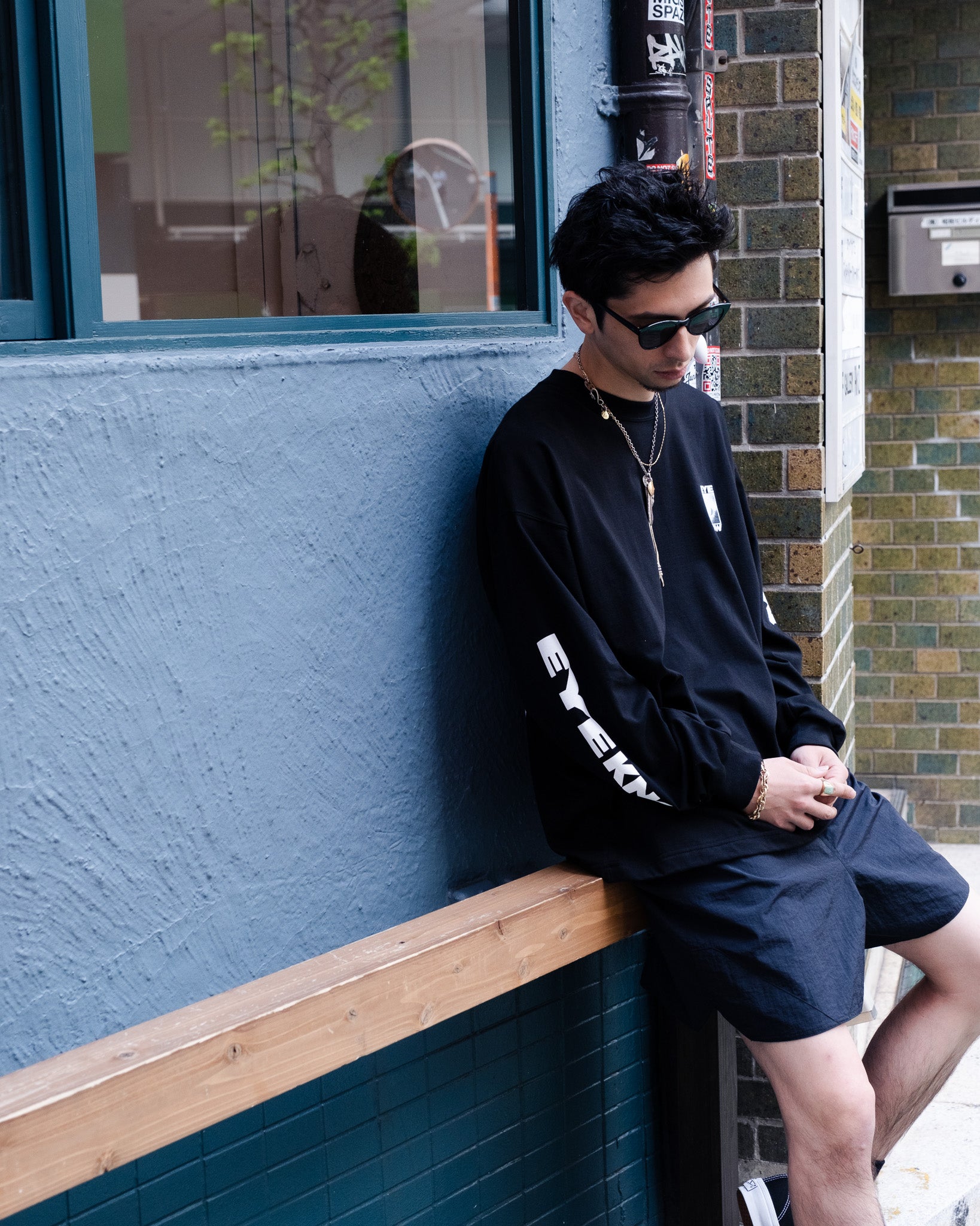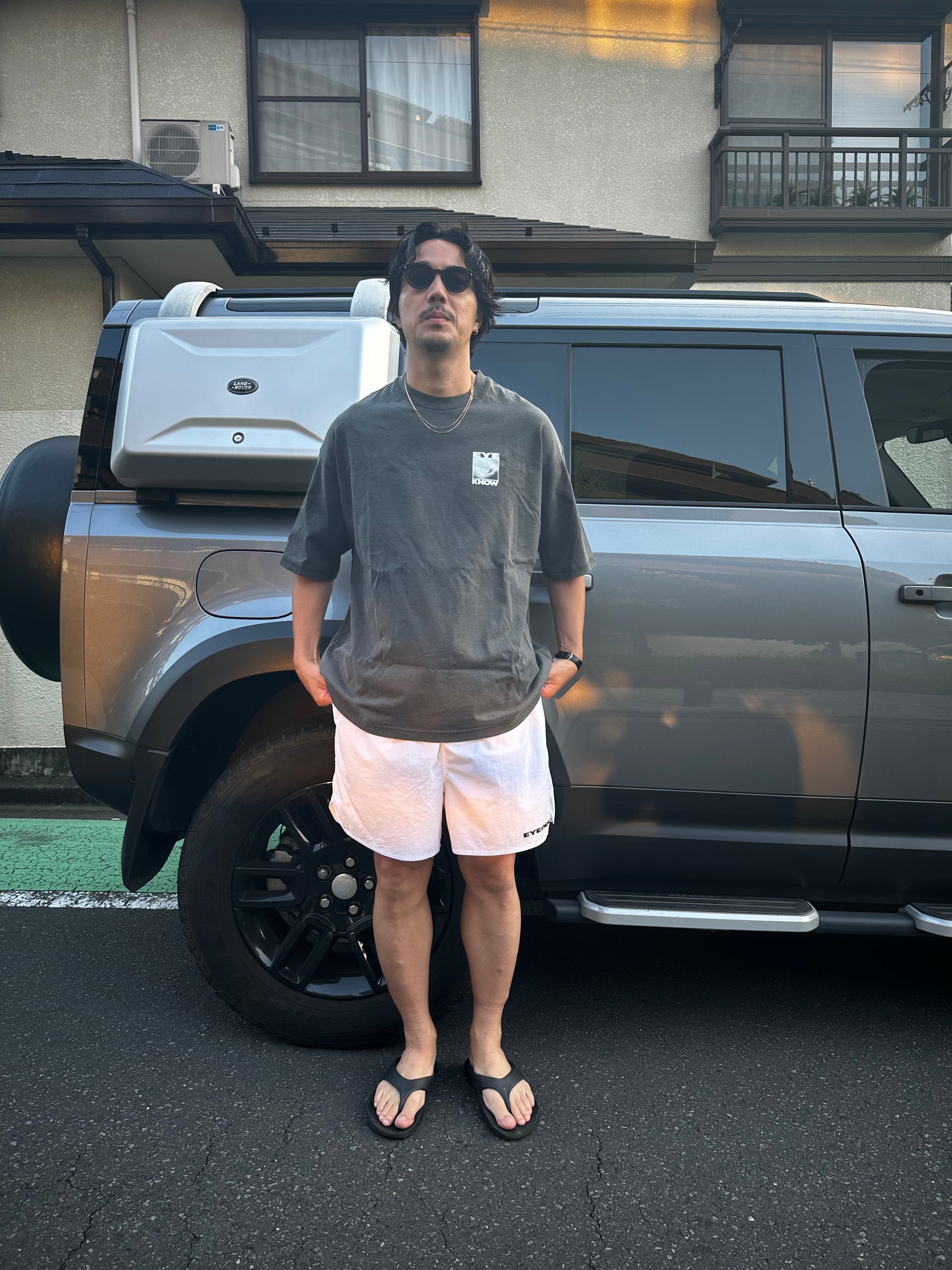 短めな着丈なんで少し大きめなシャツとかteeとかと合わせるのがブランドのおすすめです。